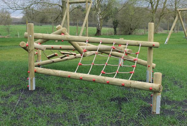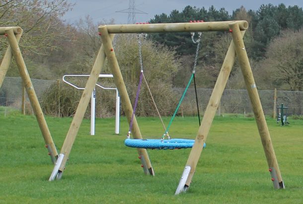 In order to save costs and deliver a multi-functional recreation area with a natural aesthetic within budget, it was decided early on that most of the surfacing requirements would be met with grass mats, providing safety in key areas while seamlessly blending into the ground (once time allows for growth). Also contributing to the ‘natural’ look of the site is the fact most of the equipment is made from round timber frames – and as the grass requires regular mowing, several metal post shoes were fitted to prevent strimmer damage to the wooden posts.