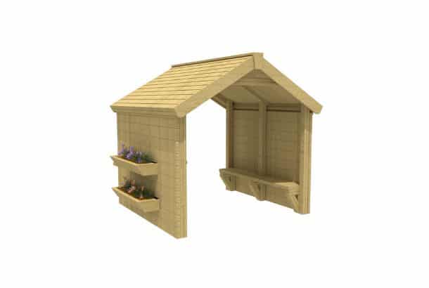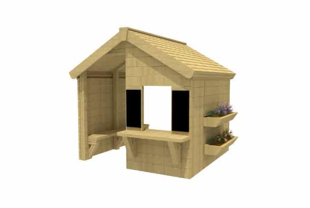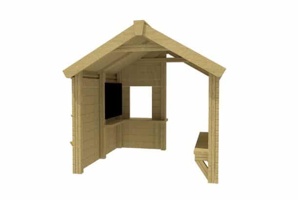 Inclusive Playhouse Two has been thoughtfully designed for accessibility and inclusive play. Its open structure allows children, including wheelchair users, to enter and explore freely. The playhouse features a chalkboard, enabling children to name their playhouse as a shop, café, or any imaginative setting. Planters provide sensory stimulation, while a window feature encourages interaction and imaginative scenarios. Built-in bench seating ensures children have a comfortable space for rest, conversation, or calm play.