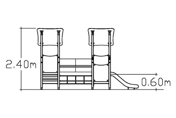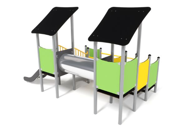 The UniMini Essentials Fenrir play unit is ideal for 3-5 year olds, featuring two low step-up platforms designed for continuous exploration without needing to step off. These platforms are connected by a wobbly rope bridge with handrails for safe traversal. One route leads up through varied-height steps to a higher platform, while another includes a ramp that leads to a platform with a slide. A tunnel bridge links the elevated platforms, providing an exciting crawl-through adventure. With sheltered top platforms, Fenrir encourages imaginative play in a secure and engaging environment, offering young explorers a variety of playful experiences. Available with timber or steel poles and adorned with vibrant HPL panels, Fenrir is adaptable to different settings. For installation, choose between a sunken foundation or above-ground anchoring.