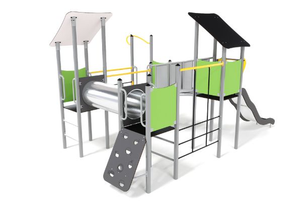 The UniMini Essentials Io play unit, designed for 3-5 year olds, offers a range of challenging play opportunities. This interconnected structure includes a tunnel bridge, a traverse rope wall, a steel ramp bridge, and a wobbly rope bridge with handrails, providing diverse and engaging movement options. For descents, children can choose between an exhilarating slide and a sliding pole. Access to the towers is provided by a climbing wall and rung ladders, accommodating children of various abilities. Available in timber or steel options and featuring vibrant HPL panels, Io is adaptable to different settings. For installation flexibility, select either a sunken foundation or above-ground anchoring.