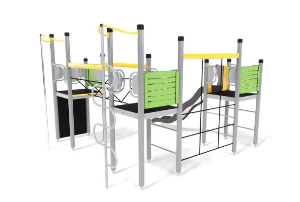 UniPlay Essentials Sycorax is an engaging L-shaped playground unit designed for children aged 5-12, featuring a journey across three platforms connected by a wobbly bridge and a challenging rope wall. This unit offers a continuous adventure from one end to the other, while each tower also provides its own distinct play area. The first tower includes a climbing wall and a sliding pole for a swift descent. The second tower is accessible via a rung ladder or a thrilling spider pole, offering diverse climbing experiences. The final tower, reached by a rung ladder, rewards climbers with a slide. Available in both timber and steel options with vibrant HPL panels, Sycorax offers flexible installation choices, including cast-in-place, sunken foundation, or above-ground anchoring.