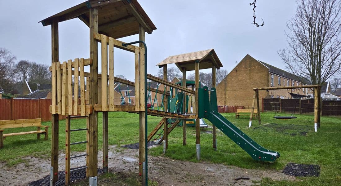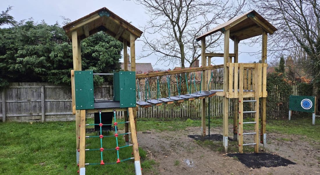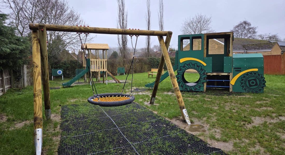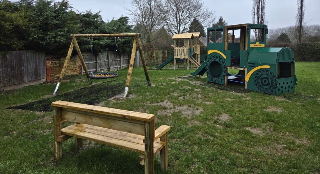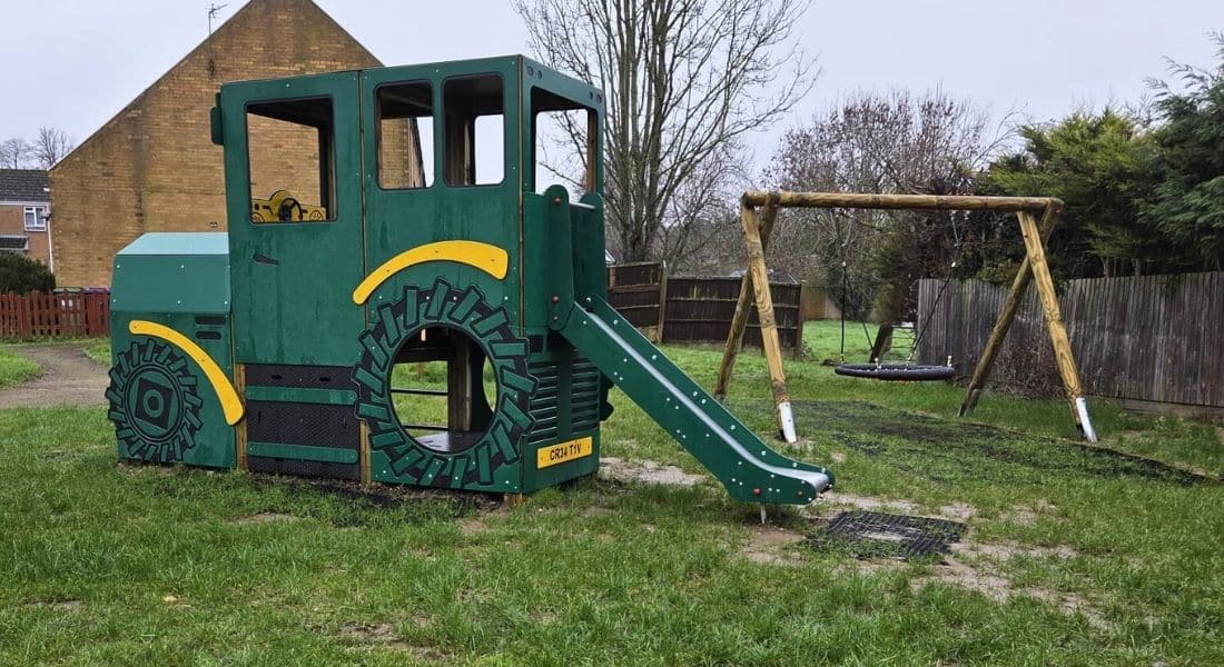 The Parish Council Denton in Grantham, Lincolnshire, has given its playground a vibrant new look with the installation of exciting play equipment, including a Snowdon jigsaw play tower, a tractor-themed play structure, and a basket swing, alongside other engaging playground features.