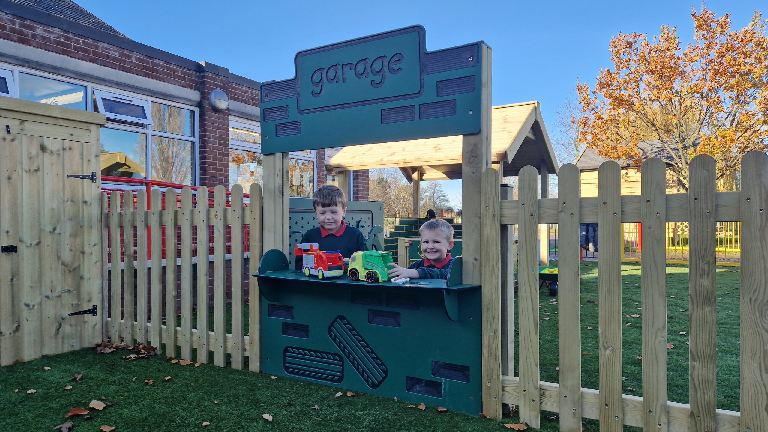 This is a school blessed with a fantastic, timber castle play area for older children, and wanted an EYFS outdoor environment that continued the level of impressiveness. Younger children there can now play at being pirates in a midi ship, or garage mechanics at a town shop play panel. Green fingers are encouraged by planters and a digging allotment, while a den-making teepee and a construction site playhouse invites creativity.